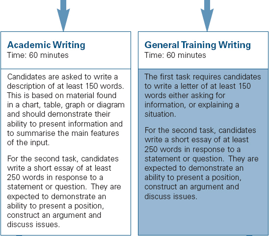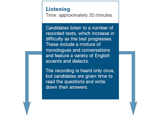 네 섹션 중 처음 두 Section은 일상적인 것에 관한 것으로 여행이나, 주택임대,부동산 문의등에 관한 두명의 대화와 monologue로 이루어지고 마지막 두 Section은 학술적(Academic)인 내용으로 예를들어 연구과제에 관한 교수와